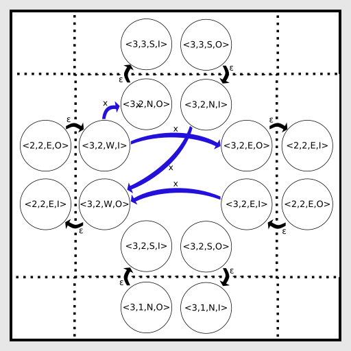 The blue transitions are the ones added by the switch. Similar to the inter tile transitions, railways can be used both ways: for horizontal railway two transitions <x,y,W,I> to <x,y,E,O> and <x,y,E,I> to <x,y,W,O> are created. Note that, contrary to the inter tile transitions, the intra tile transitions lead from “I” to “O”.